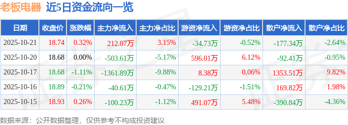 证券之星消息,截至2025年10月21日收盘,老板电器(002508)报收于18.74元,上涨0.32%,换手率0.38%,成交量3.59万手,成交额6728.88万元。