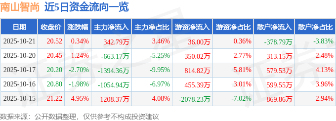 证券之星消息,截至2025年10月21日收盘,南山智尚(300918)报收于20.52元,上涨0.34%,换手率1.11%,成交量4.84万手,成交额9893.23万元。