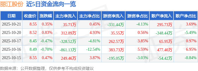 证券之星消息,截至2025年10月21日收盘,丽江股份(002033)报收于8.55元,上涨0.35%,换手率1.71%,成交量9.39万手,成交额8020.07万元。