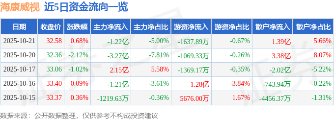 10月21日的资金流向数据方面,主力资金净流出1.22亿元,占总成交额5.0%,游资资金净流出1637.89万元,占总成交额0.67%,散户资金净流入1.39亿元,占总成交额5.66%。