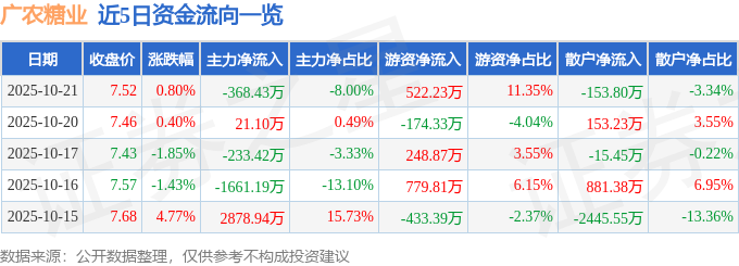 证券之星消息,截至2025年10月21日收盘,广农糖业(000911)报收于7.52元,上涨0.8%,换手率1.54%,成交量6.15万手,成交额4602.65万元。