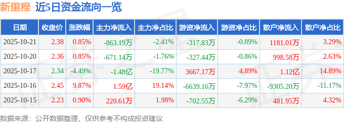 证券之星消息,截至2025年10月21日收盘,新里程(002219)报收于2.38元,上涨0.85%,换手率4.61%,成交量150.83万手,成交额3.59亿元。