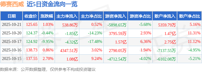 10月21日的资金流向数据方面,主力资金净流入538.86万元,占总成交额0.52%,游资资金净流出5898.65万元,占总成交额5.68%,散户资金净流入5359.79万元,占总成交额5.16%。