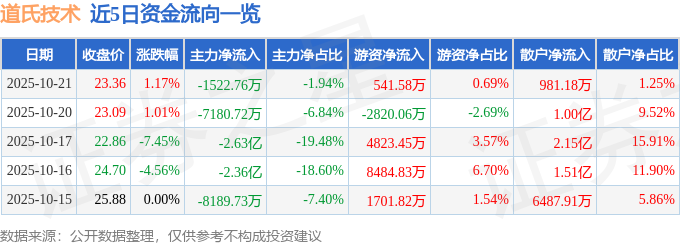 证券之星消息,截至2025年10月21日收盘,道氏技术(300409)报收于23.36元,上涨1.17%,换手率4.88%,成交量33.57万手,成交额7.86亿元。