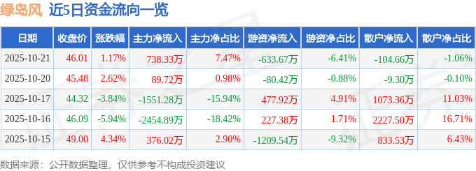 证券之星消息,截至2025年10月21日收盘,绿岛风(301043)报收于46.01元,上涨1.17%,换手率3.84%,成交量2.18万手,成交额9883.72万元。