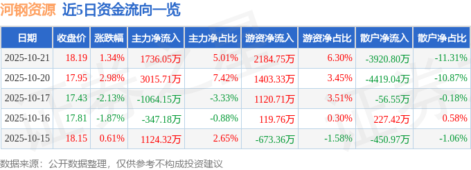 证券之星消息,截至2025年10月21日收盘,河钢资源(000923)报收于18.19元,上涨1.34%,换手率3.02%,成交量18.97万手,成交额3.47亿元。