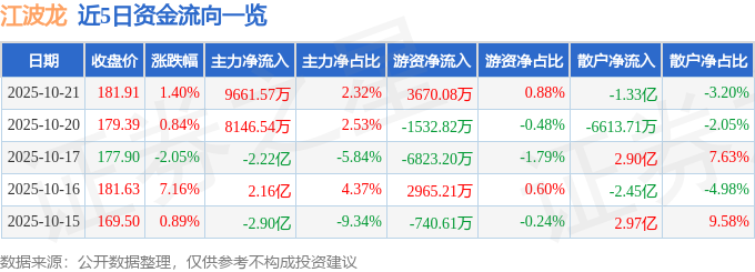 证券之星消息,截至2025年10月21日收盘,江波龙(301308)报收于181.91元,上涨1.4%,换手率8.16%,成交量22.39万手,成交额41.63亿元。