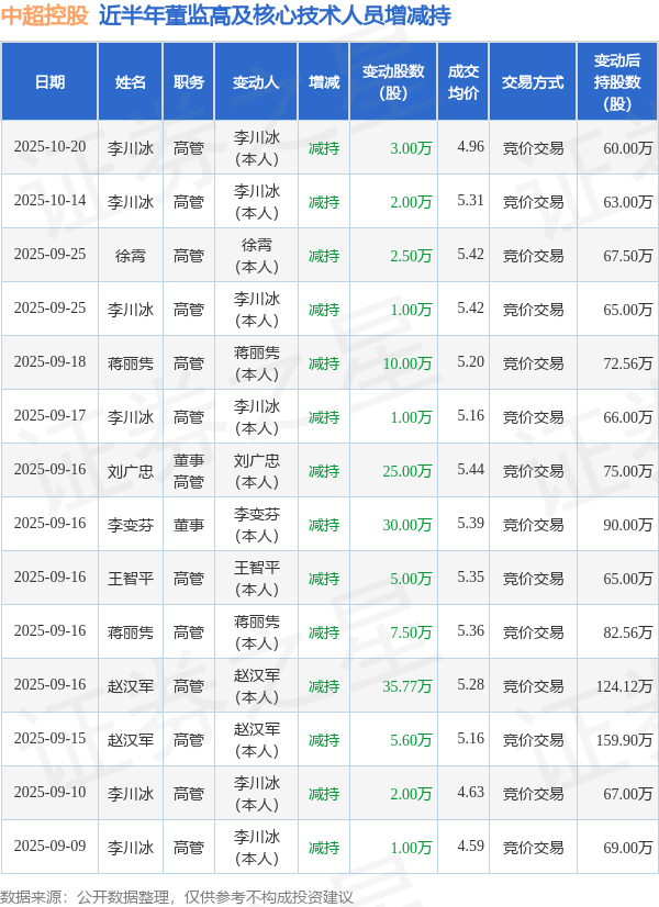 中超控股近半年内的董监高及核心技术人员增减持详情如下: