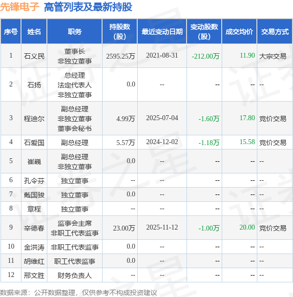 先锋电子近半年内的董监高及核心技术人员增减持详情如下: