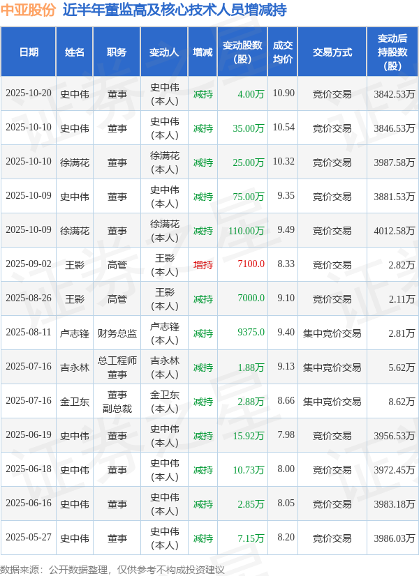 中亚股份近半年内的董监高及核心技术人员增减持详情如下:
