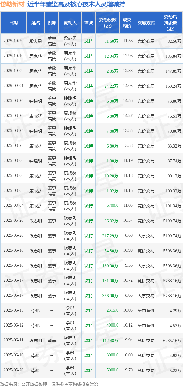 岱勒新材近半年内的董监高及核心技术人员增减持详情如下: