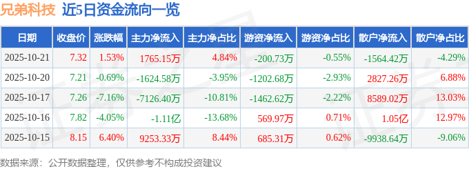 证券之星消息,截至2025年10月21日收盘,兄弟科技(002562)报收于7.32元,上涨1.53%,换手率7.18%,成交量50.36万手,成交额3.65亿元。