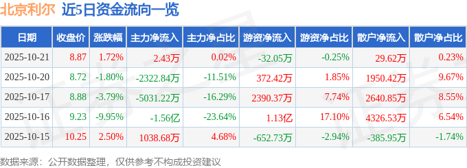证券之星消息,截至2025年10月21日收盘,北京利尔(002392)报收于8.87元,上涨1.72%,换手率1.26%,成交量14.43万手,成交额1.27亿元。