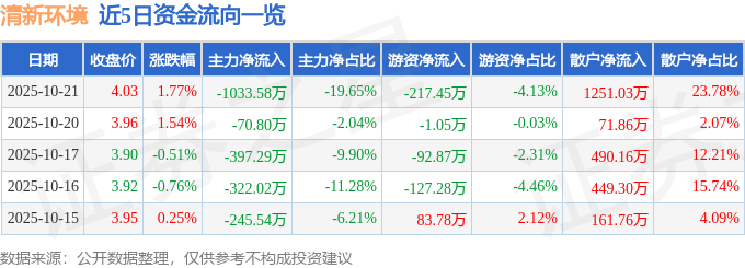 证券之星消息,截至2025年10月21日收盘,清新环境(002573)报收于4.03元,上涨1.77%,换手率0.93%,成交量13.14万手,成交额5260.41万元。