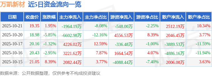 证券之星消息,截至2025年10月21日收盘,万凯新材(301216)报收于19.35元,上涨1.95%,换手率2.34%,成交量12.66万手,成交额2.43亿元。