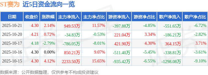 证券之星消息,截至2025年10月21日收盘,ST赛为(300044)报收于4.3元,上涨2.14%,换手率2.69%,成交量19.25万手,成交额8209.19万元。
