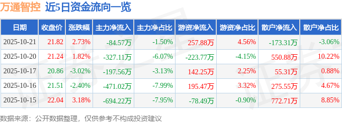 证券之星消息,截至2025年10月21日收盘,万通智控(300643)报收于21.82元,上涨2.73%,换手率1.14%,成交量2.62万手,成交额5654.77万元。