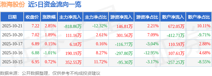 证券之星消息,截至2025年10月21日收盘,渤海股份(000605)报收于7.22元,上涨2.85%,换手率2.64%,成交量9.32万手,成交额6646.52万元。
