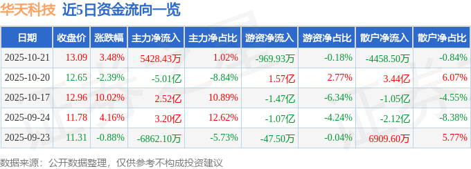 证券之星消息,截至2025年10月21日收盘,华天科技(002185)报收于13.09元,上涨3.48%,换手率12.84%,成交量414.48万手,成交额53.33亿元。