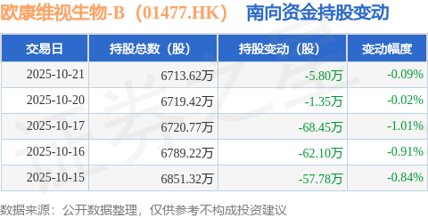 证券之星消息,10月21日南向资金减持5.8万股欧康维视生物-B(01477.HK)。近5个交易日中,获南向资金减持的有5天,累计净减持195.48万股。近20个交易日中,获南向资金减持的有20天,累计净减持2405.43万股。截至目前,南向资金持有欧康维视生物-B(01477.HK)6713.62万股,占公司已发行普通股的8.02%。