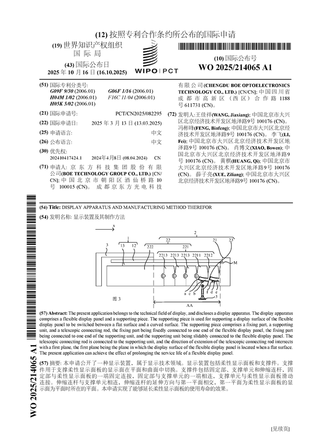 证券之星消息,根据企查查数据显示京东方A(000725)公布了一项国际专利申请,专利名为“显示装置及其制作方法”,专利申请号为PCT/CN2025/082295,国际公布日为2025年10月16日。