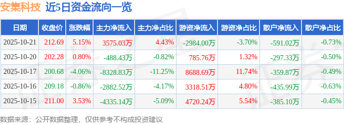 证券之星消息,截至2025年10月21日收盘,安集科技(688019)报收于212.69元,上涨5.15%,换手率2.28%,成交量3.84万手,成交额8.06亿元。