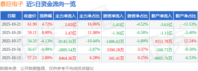 证券之星消息,截至2025年10月21日收盘,景旺电子(603228)报收于61.9元,上涨4.72%,换手率5.23%,成交量51.04万手,成交额31.27亿元。