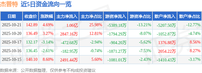 10月21日的资金流向数据方面,主力资金净流入1.06亿元,占总成交额25.98%,游资资金净流出5389.18万元,占总成交额13.21%,散户资金净流出5207.5万元,占总成交额12.77%。