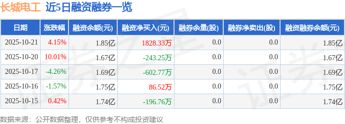 长城电工融资融券信息显示,融资方面,当日融资买入3134.8万元,融资偿还1306.47万元,融资净买入1828.33万元。融券方面,融券卖出0.0股,融券偿还0.0股,融券余量0.0股,融券余额0.0万元。融资融券余额1.85亿元。