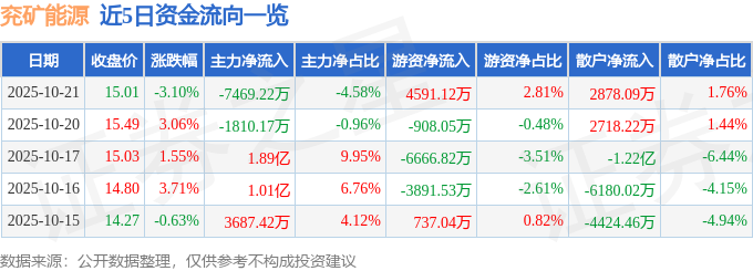 证券之星消息,截至2025年10月21日收盘,兖矿能源(600188)报收于15.01元,下跌3.1%,换手率1.85%,成交量109.51万手,成交额16.31亿元。