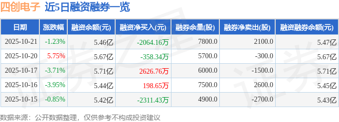 四创电子融资融券信息显示,融资方面,当日融资买入2397.99万元,融资偿还4462.16万元,融资净偿还2064.16万元。融券方面,融券卖出2100.0股,融券偿还0.0股,融券余量7800.0股,融券余额21.96万元。融资融券余额5.47亿元。
