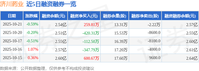 济川药业融资融券信息显示,融资方面,当日融资买入941.57万元,融资偿还681.76万元,融资净买入259.81万元。融券方面,融券卖出500.0股,融券偿还2.27万股,融券余量13.31万股,融券余额333.62万元。融资融券余额2.57亿元。