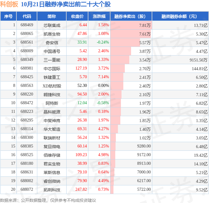 科创板融券净卖出前三分别为:芯联集成(688469)融券净卖出7.81万股、凯赛生物(688065)融券净卖出7.61万股、奇安信(688561)融券净卖出5.57万股,前20具体见下表: