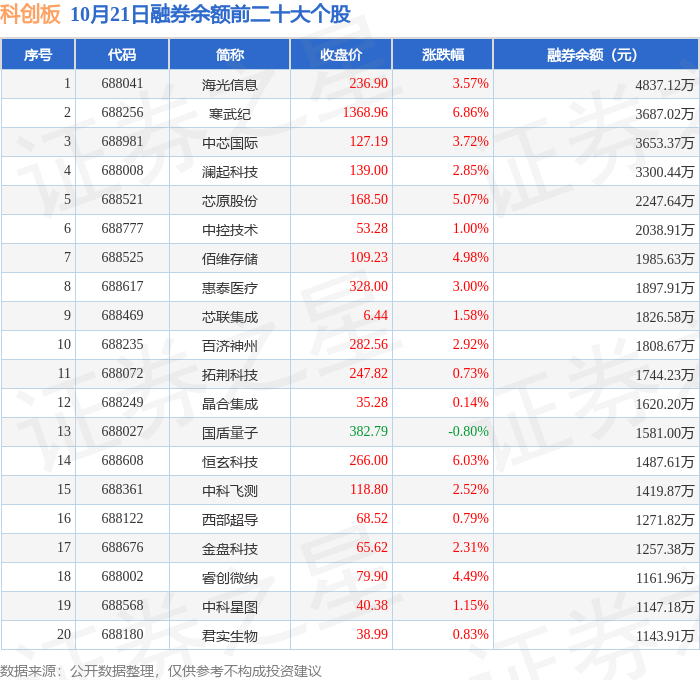 科创板融券余额前三分别为:海光信息(688041)融券余额4837.12万元、寒武纪(688256)融券余额3687.02万元、中芯国际(688981)融券余额3653.37万元,前20具体见下表: