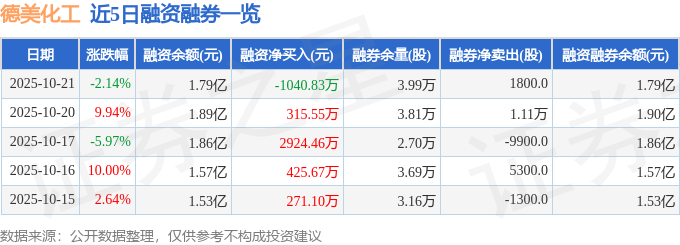 德美化工融资融券信息显示,融资方面,当日融资买入7477.87万元,融资偿还8518.7万元,融资净偿还1040.83万元。融券方面,融券卖出1900.0股,融券偿还100.0股,融券余量3.99万股,融券余额31.08万元。融资融券余额1.79亿元。