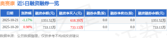 奥赛康融资融券信息显示,融资方面,当日融资买入960.85万元,融资偿还342.46万元,融资净买入618.39万元,连续3日净买入累计1351.52万元。融券方面,融券卖出0.0股,融券偿还0.0股,融券余量0.0股,融券余额0.0万元。融资融券余额1351.52万元。