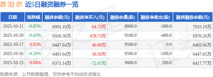 苏 泊 尔融资融券信息显示,融资方面,当日融资买入701.56万元,融资偿还636.82万元,融资净买入64.73万元,连续3日净买入累计589.46万元。融券方面,融券卖出0.0股,融券偿还300.0股,融券余量8800.0股,融券余额42.09万元。融资融券余额7033.19万元。