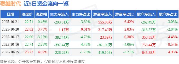 证券之星消息,截至2025年10月21日收盘,赛维时代(301381)报收于22.71元,下跌0.48%,换手率1.96%,成交量3.84万手,成交额8661.49万元。