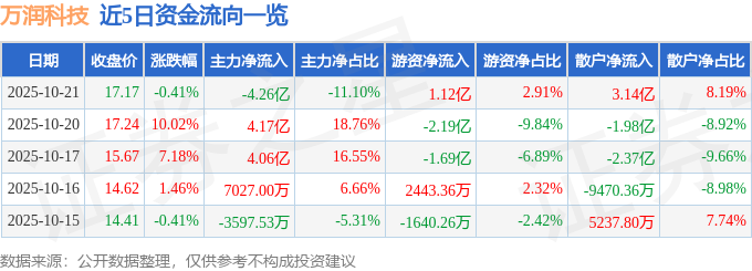 证券之星消息,截至2025年10月21日收盘,万润科技(002654)报收于17.17元,下跌0.41%,换手率26.74%,成交量226.0万手,成交额38.39亿元。