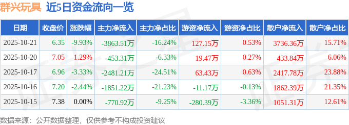 证券之星消息,截至2025年10月21日收盘,群兴玩具(002575)报收于6.35元,下跌9.93%,跌停,换手率6.33%,成交量37.41万手,成交额2.38亿元。