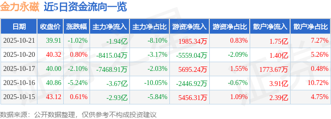 证券之星消息,截至2025年10月21日收盘,金力永磁(300748)报收于39.91元,下跌1.02%,换手率5.34%,成交量60.39万手,成交额24.0亿元。
