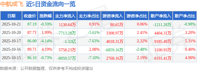 证券之星消息,截至2025年10月21日收盘,中航成飞(302132)报收于87.19元,下跌0.59%,换手率2.43%,成交量14.27万手,成交额12.42亿元。