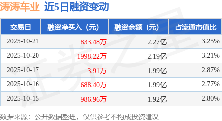 证券之星消息,10月21日,涛涛车业(301345)融资买入4769.64万元,融资偿还3936.16万元,融资净买入833.48万元,融资余额2.27亿元,近3个交易日已连续净买入累计2835.61万元,近20个交易日中有13个交易日出现融资净买入。