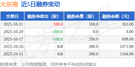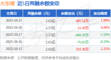 证券之星消息,10月21日,大东南(002263)融资买入2185.89万元,融资偿还1700.39万元,融资净买入485.5万元,融资余额2.62亿元。