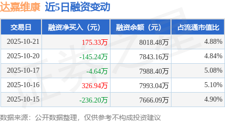 证券之星消息,10月21日,达嘉维康(301126)融资买入490.45万元,融资偿还315.13万元,融资净买入175.33万元,融资余额8018.48万元。