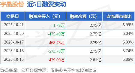 证券之星消息,10月21日,宇晶股份(002943)融资买入1238.95万元,融资偿还1240.66万元,融资净卖出1.72万元,融资余额2.75亿元。