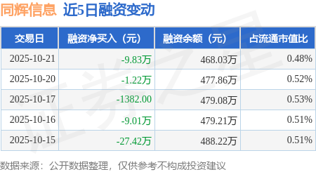 证券之星消息,10月21日,同辉信息(920090)融资买入38.85万元,融资偿还48.68万元,融资净卖出9.83万元,融资余额468.03万元。