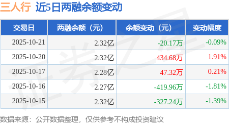 证券之星消息,10月21日,三人行(605168)融资买入563.2万元,融资偿还582.7万元,融资净卖出19.5万元,融资余额2.32亿元。
