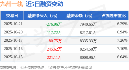 证券之星消息,10月21日,九州一轨(688485)融资买入1168.63万元,融资偿还1445.59万元,融资净卖出276.96万元,融资余额7940.65万元,近20个交易日中有11个交易日出现融资净买入。