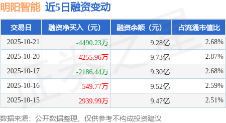 证券之星消息,10月21日,明阳智能(601615)融资买入6878.44万元,融资偿还1.14亿元,融资净卖出4490.23万元,融资余额9.28亿元,近20个交易日中有11个交易日出现融资净买入。
